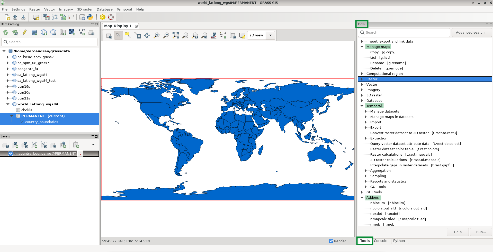 Además con el GRASS provider, podemos visualizar nuestros proyectos, mapsets y mapas de la base de datos de GRASS en QGIS: