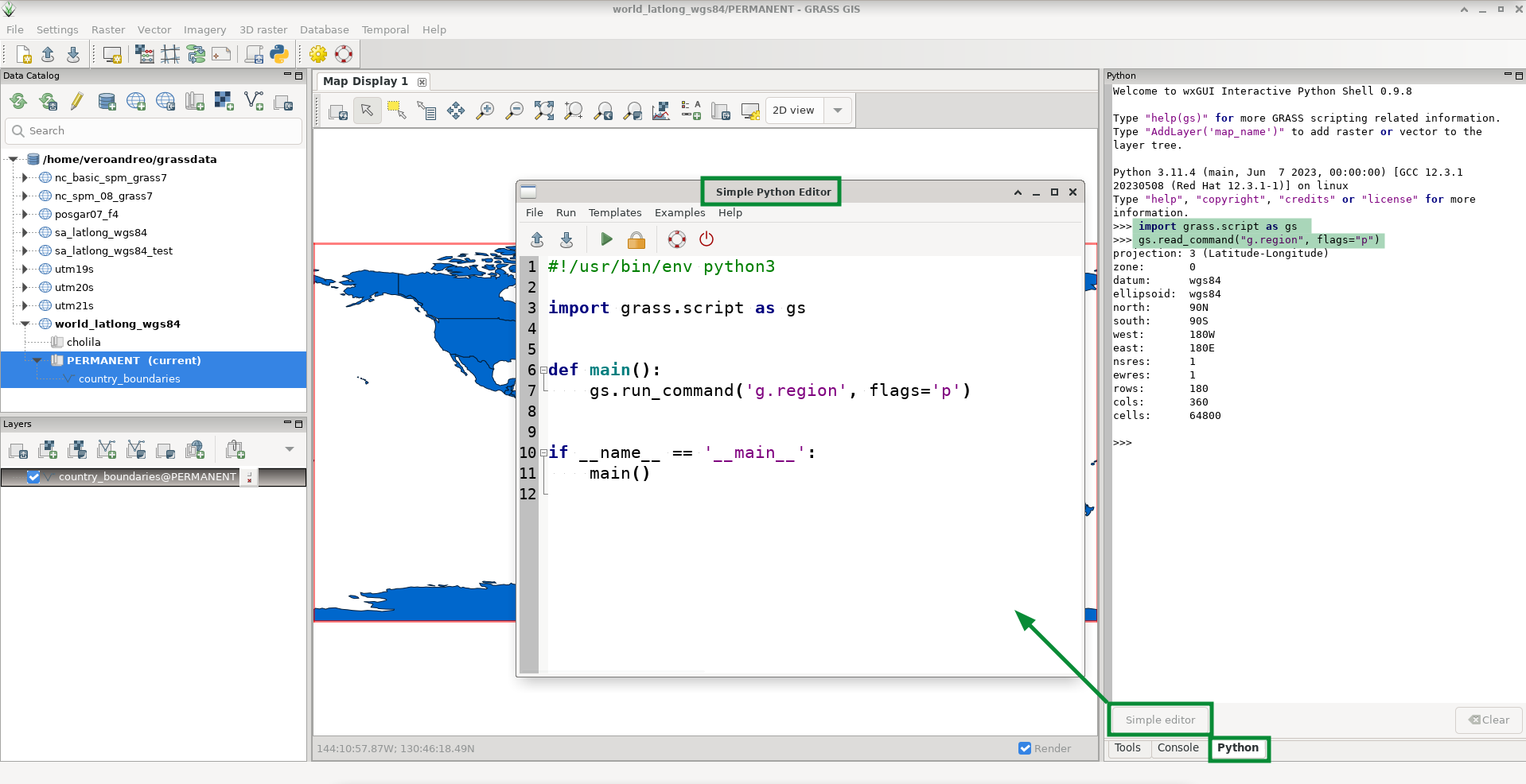 history para ver todos los comandos anteriores<CTRL-R>history > my_protocol.sh, pulir/anotar el protocolo y volver a ejecutar con: sh my_protocol.shLa forma más sencilla de ejecutar una rutina de Python en GRASS GIS, es a través del Simple Python editor … o también se puede escribir la rutina en un editor de texto y ejecutarla desde la línea de comandos (terminal negra) o la GUI (File > Launch script):