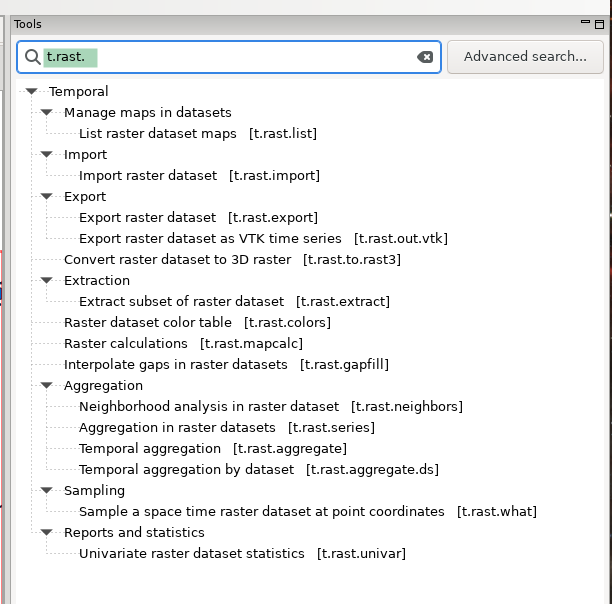 | t.* | temporal | space-time datasets | t.rast.aggregate: raster time series aggregation |