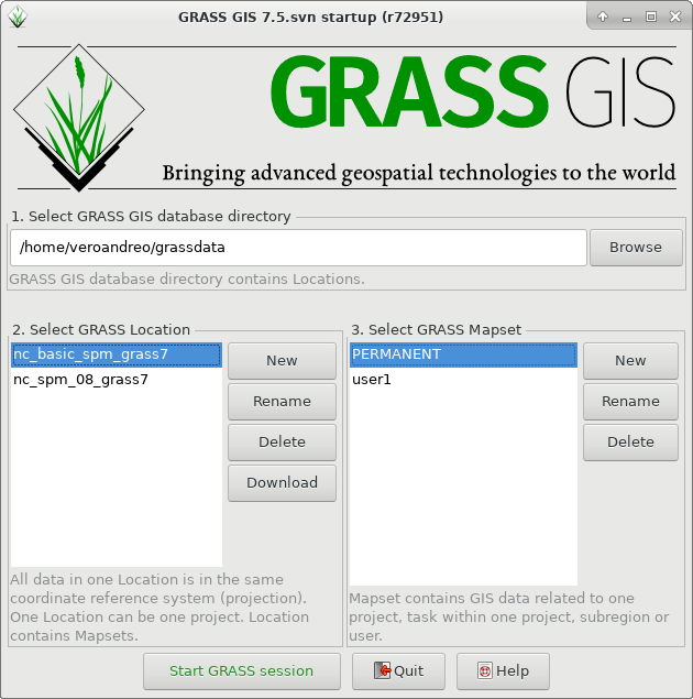 grassdata que contiene todos nuestros PROYECTOsPara iniciar GRASS GIS se necesita especificar una ruta compuesta de Database, Proyecto y Mapset